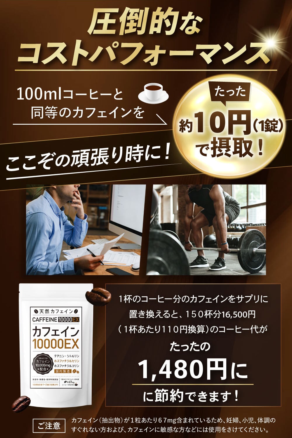 🟤一袋あたりカフェイン10000mg配合(150錠/1錠あたりカフェイン含有量67mg)で、さらに人気成分であるテアニン、シトルリンも入ったこだわりのカフェインサプリメントです。コーヒーがニガテな方にも飲みやすい、錠剤タイプのカフェインサプリメントです。保存料無添加、無香料・無着色。